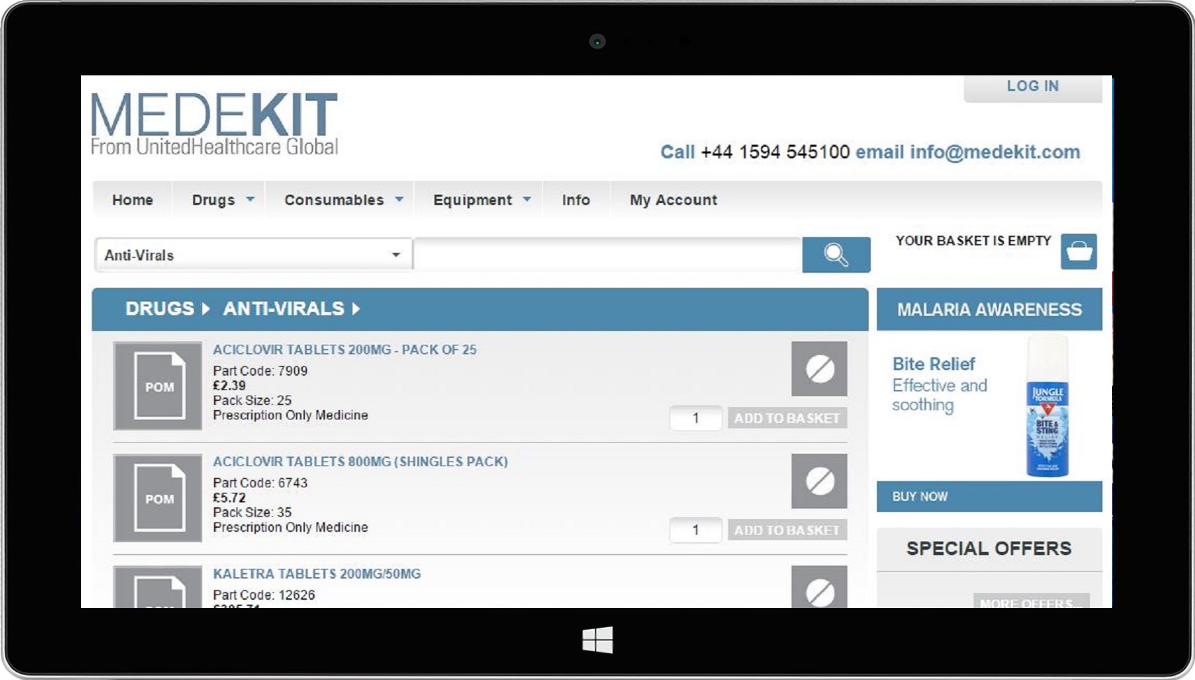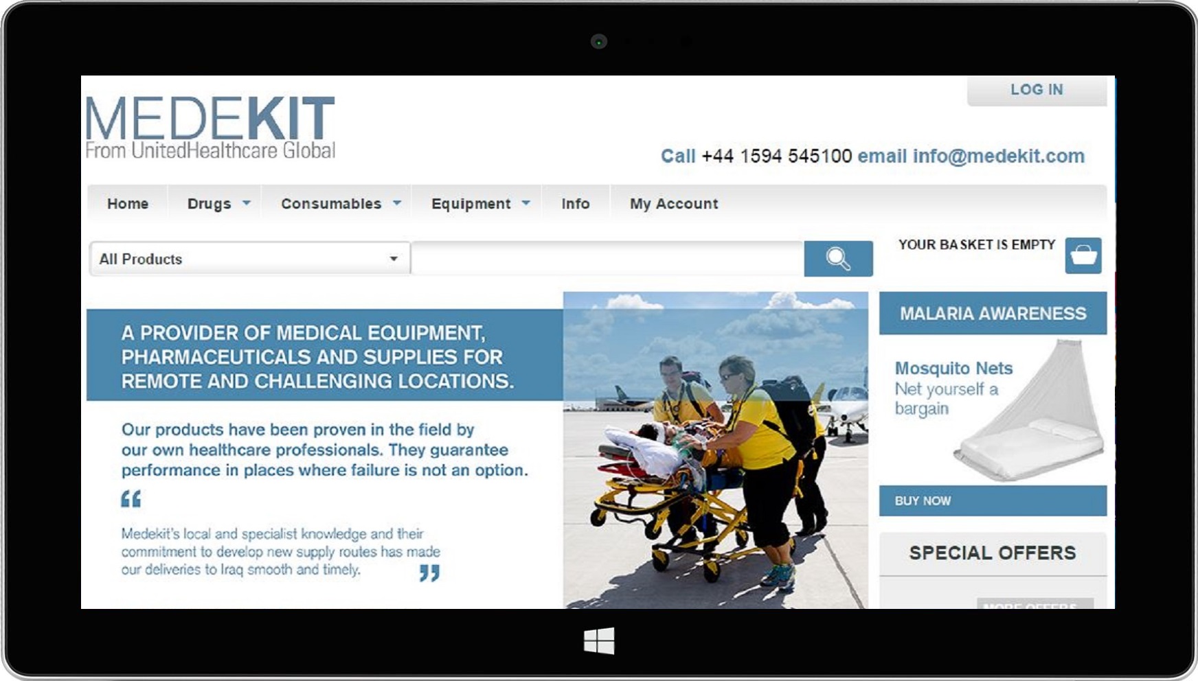 Medekit supply medical equipment to first aid professionals in atypical situations. Due to the complexity of the products sold and their various legal restrictions, ProspectSoft and Medekit have produced a site that allows varying buyer permission. The site also uses synonymic searching and detailed product description to make ordering the correct equipment as easy as possible.
